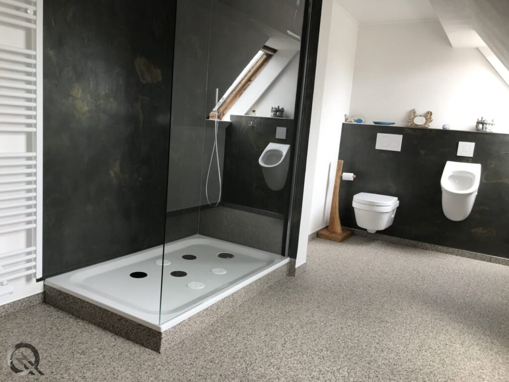 Keine Fugen mehr im Badezimmer – mit Qubo® Steinteppich wird es Wirklichkeit! Unsere fugenlose Beschichtung passt sich spielend den Raumkonturen an und ist in zahlreichen Farbtönen verfügbar, sodass Sie Ihr Badezimmer individuell gestalten können. Verleihen Sie Ihrem Qubo® Steinteppich eine besondere Note mit Kies-Fußleisten oder kreativen Steinteppich-Motiven. Genießen Sie das angenehme Gefühl des Barfußlaufens auf der glatten, warmen und komfortablen Oberfläche.