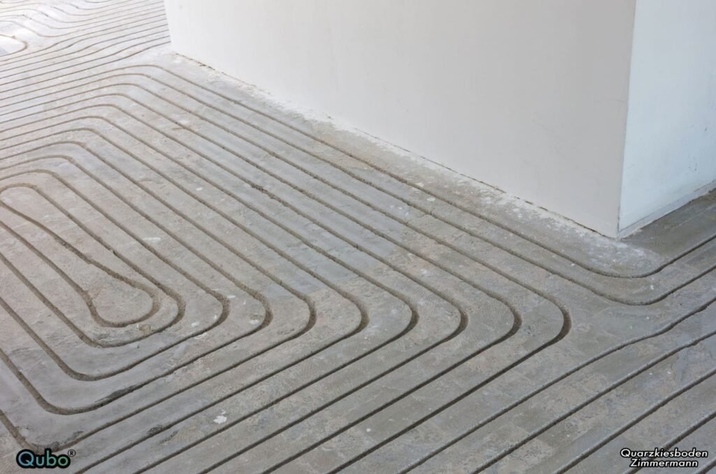 Ein Steinteppich ist nur wenige Millimeter stark und wird direkt auf die vorbereiteten Heizschleifen aufgetragen. So wird die Wärme optimal auf die Kiesoberfläche übertragen und schnell in den Raum abgegeben.