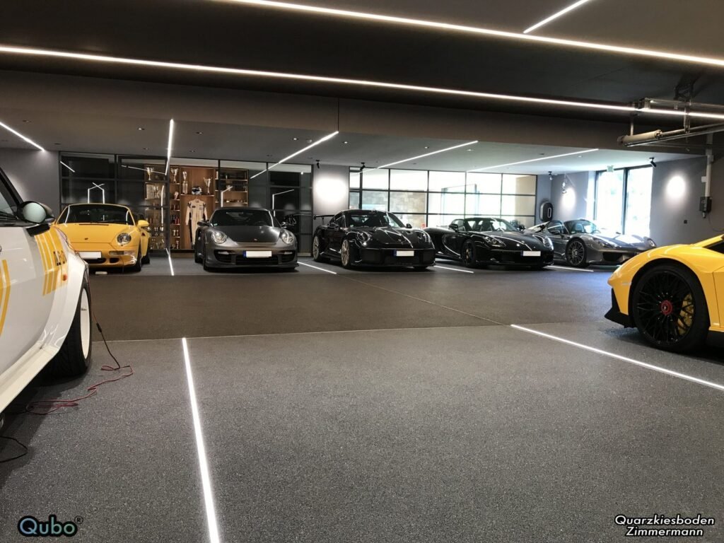 In Garagen verwenden wir bevorzugt den Qubo® Steinteppich aus Quarzkies, da er im Vergleich zu Marmorkies deutlich widerstandsfähiger ist. Ein Garagenboden muss schließlich viel aushalten – etwa das regelmäßige Befahren mit Fahrzeugen, schwere Maschinen oder belastete Regalsysteme. Außerdem sollte die Oberfläche beständig gegenüber Öl und Benzin sein. Ein Boden aus Quarzkies erfüllt all diese Anforderungen und behält auch nach jahrelanger Nutzung sein attraktives Erscheinungsbild.